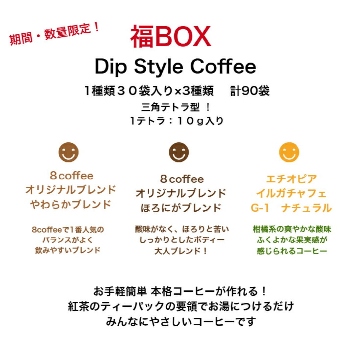 本格コーヒーを楽しめるディップスタイルコーヒー3種類×30個の福袋♪