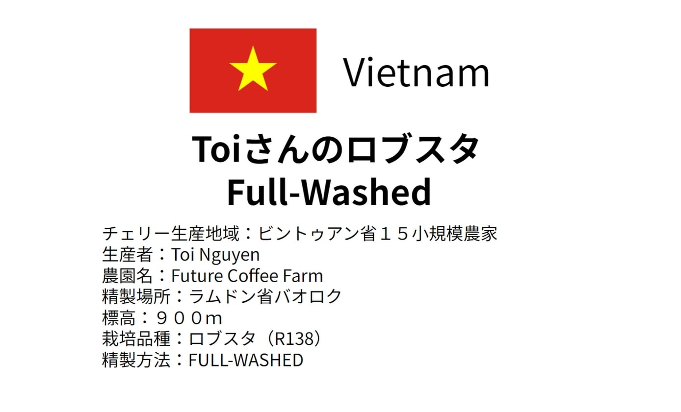 ベトナムのFuture Coffee Farmからお届けする「Toiさんのロブスタ」は、フルウォッシュド製法で丁寧に処理された高品質のロブスタコーヒーです。中深煎りのシティローストにより、豊かな風味と深いコクが引き出されています。最高の一杯を楽しむことができます。